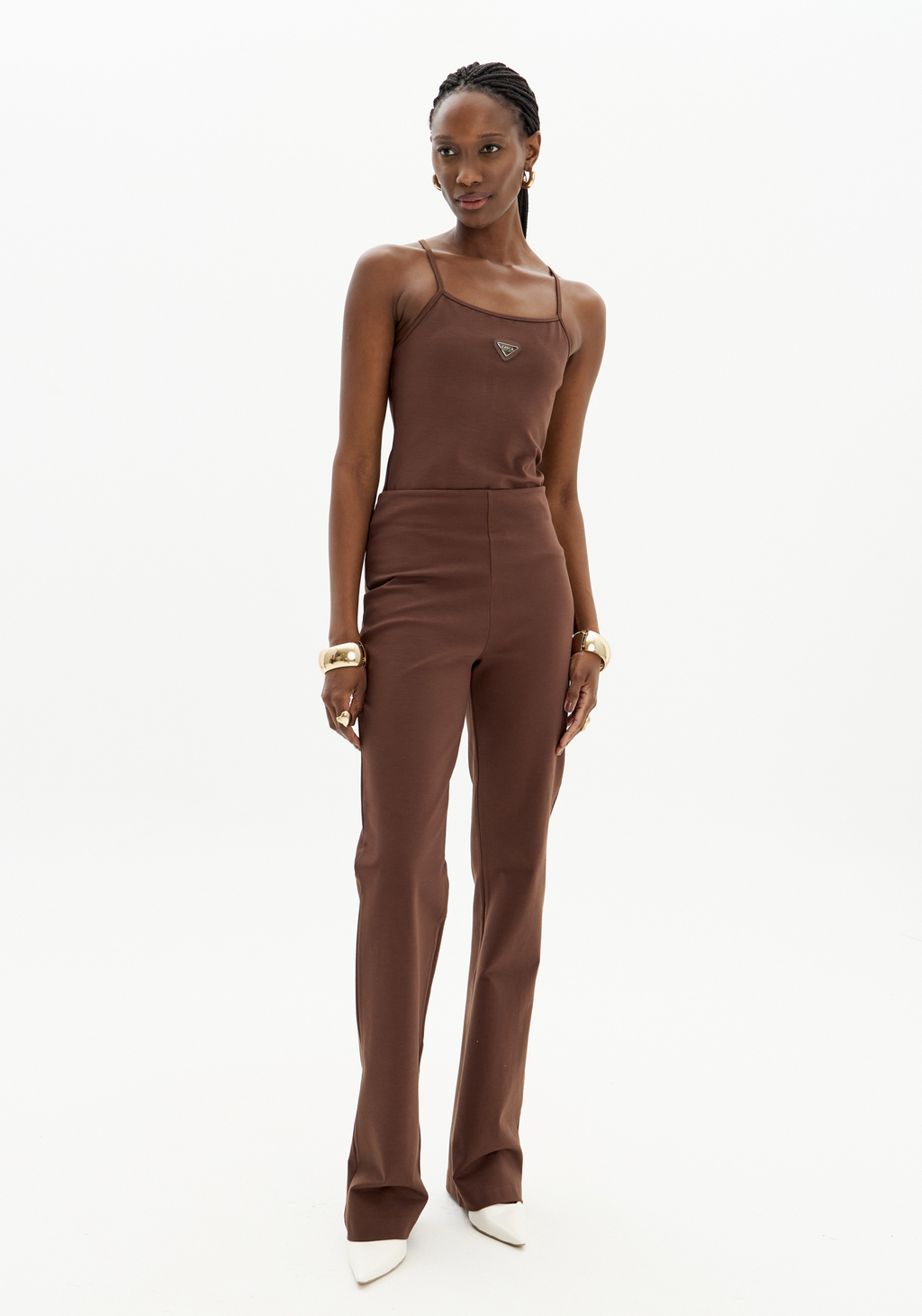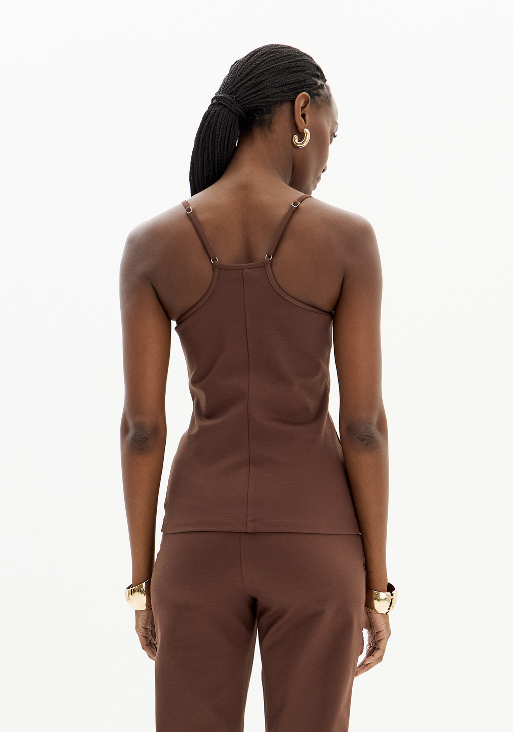 A blusa regata é confeccionada em malha encorpada com caimento justo ao corpo. Apresenta alças finas com regulador, decote reto e placa decorativa aplicada na parte frontal. Aposte nesta escolha e eleve seus looks casuais!