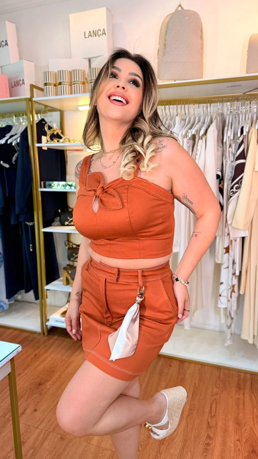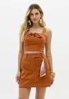 A blusa cropped é confeccionada em tecido plano encorpado, garantindo estrutura e caimento impecável ao corpo. O modelo apresenta alças largas, decote reto e recorte frontal com laço, que traz um toque feminino e moderno. O fechamento posterior por zíper proporciona praticidade e ajuste perfeito.