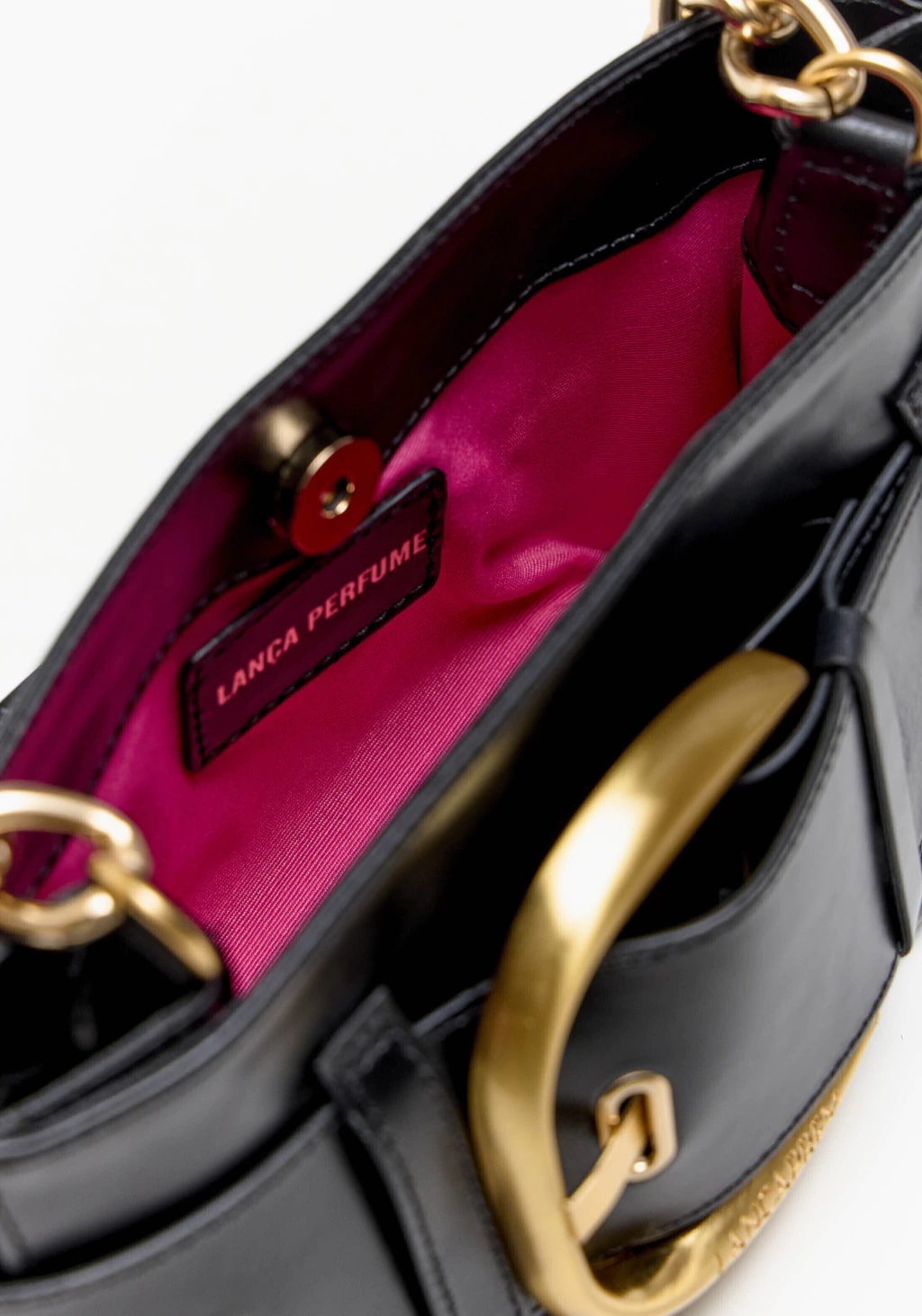 Bolsa Lança Perfume em couro legítimo preto, com design moderno e detalhes imponentes. O modelo traz a icônica fivela maxi dourada em formato oval, que confere sofisticação e personalidade única à peça. Possui alça dupla em couro com detalhe de corrente dourada e interior contrastante em tecido rosa, valorizando ainda mais o acabamento premium.