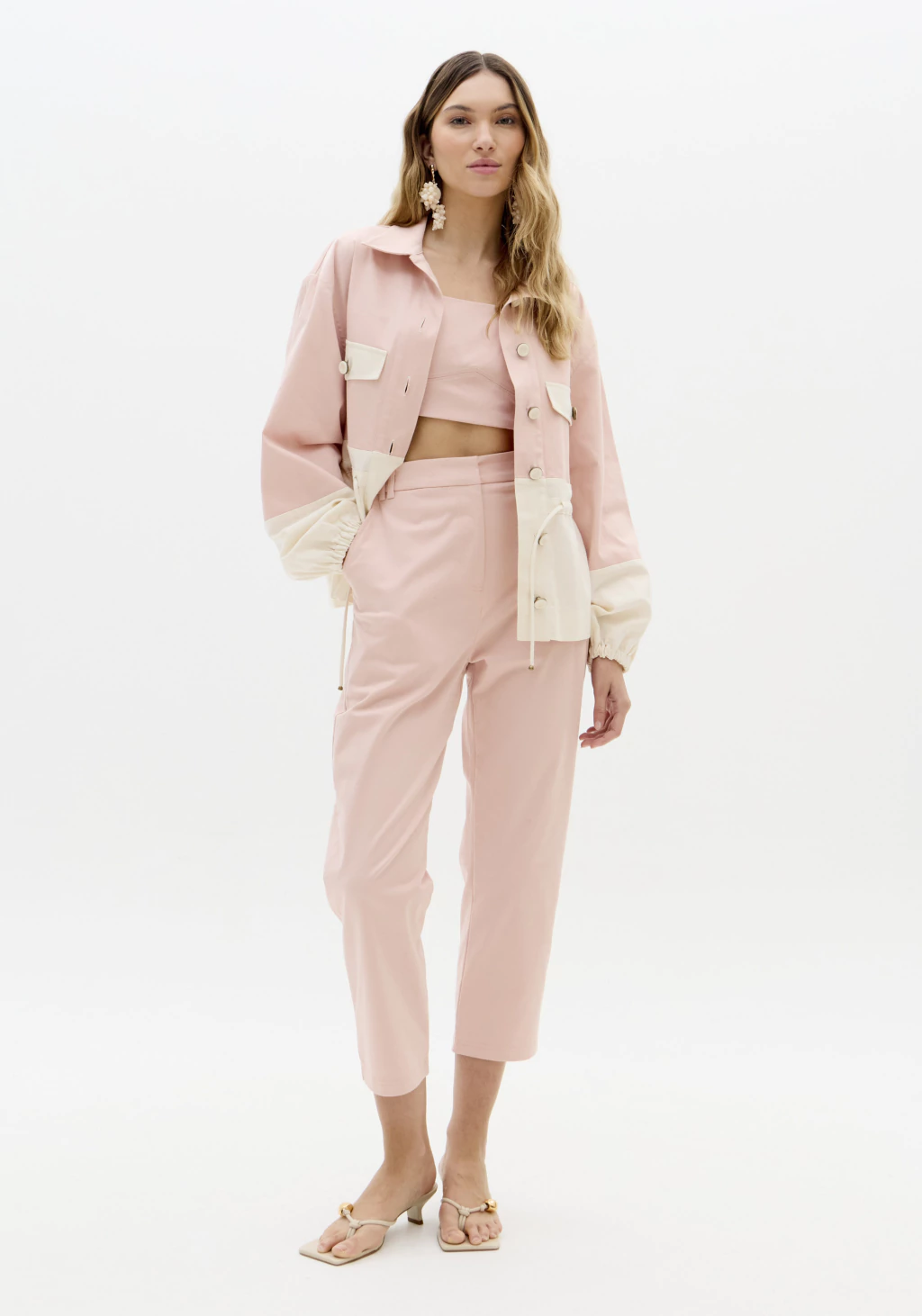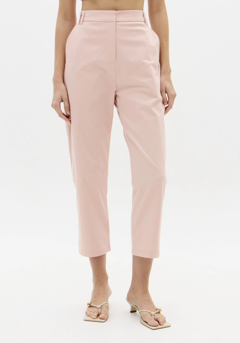 A calça apresenta modelagem carrot, conhecida por valorizar a silhueta com caimento confortável no quadril e leve afunilamento nas pernas. Confeccionada em tecido plano pesado (97% algodão e 3% elastano), garante estrutura e liberdade de movimento ao mesmo tempo.