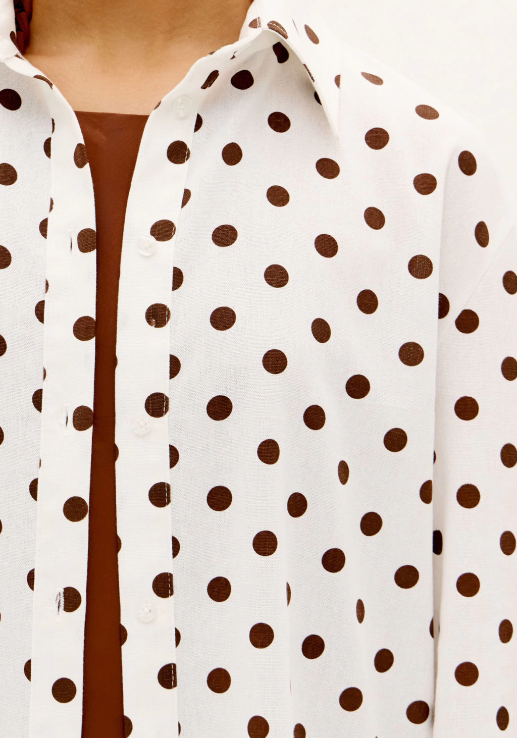 A Camisa de Poá My Favorite Things traz o toque retrô do poá em uma proposta leve e moderna. Confeccionada em tecido fluido, ela apresenta estampa clássica de bolinhas marrons sobre fundo branco, criando contraste sofisticado e super versátil. Sua modelagem reta e levemente alongada garante caimento impecável, perfeita para diferentes composições.