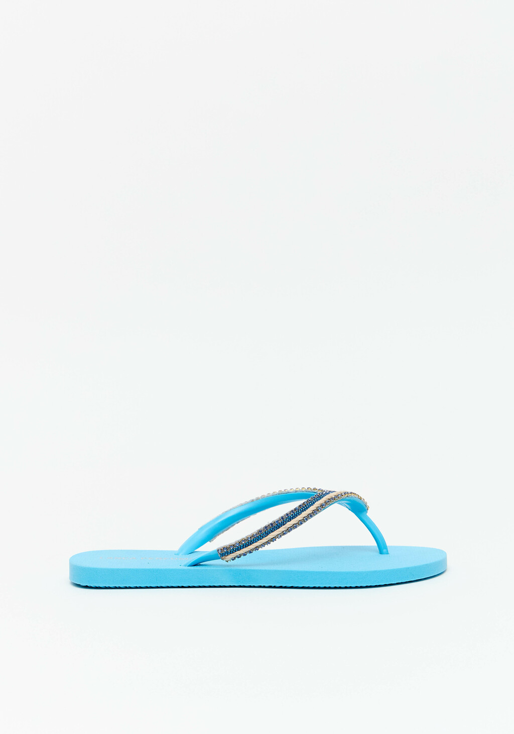 Migas com modelagem tradicional e frente redonda, este chinelo de tiras finas se destaca pelas aplicações, garantindo um visual moderno e elegante. Uma escolha indispensável para as suas composições diárias!