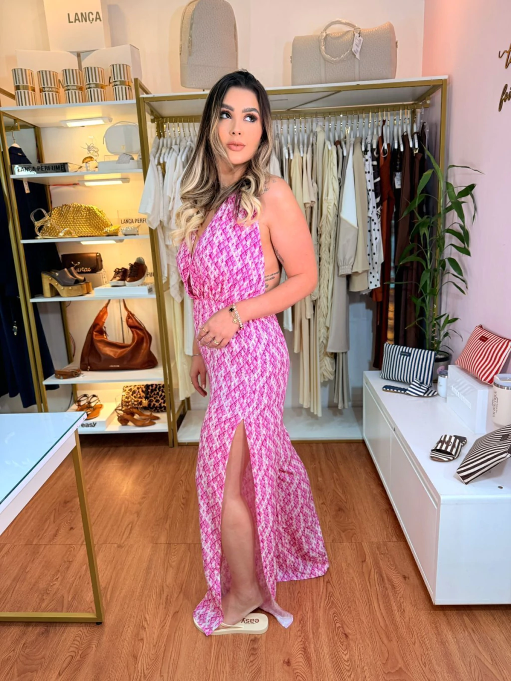 Macacão longo em tecido leve e fluido, com estampa geométrica em tons de rosa que trazem frescor e feminilidade ao look. O decote profundo alonga a silhueta e garante um visual moderno, enquanto a amarração no pescoço valoriza o colo e deixa as costas totalmente aparentes.