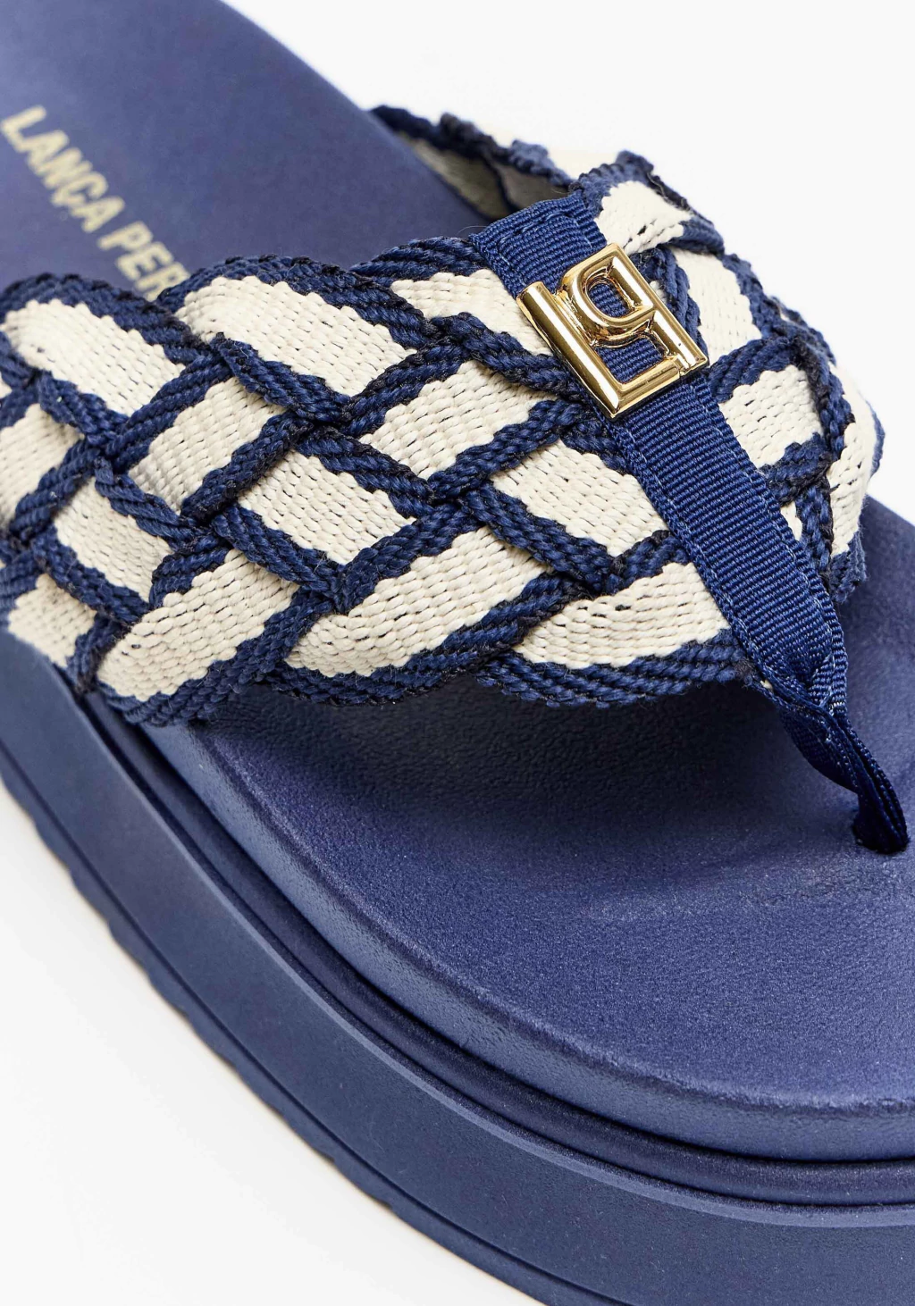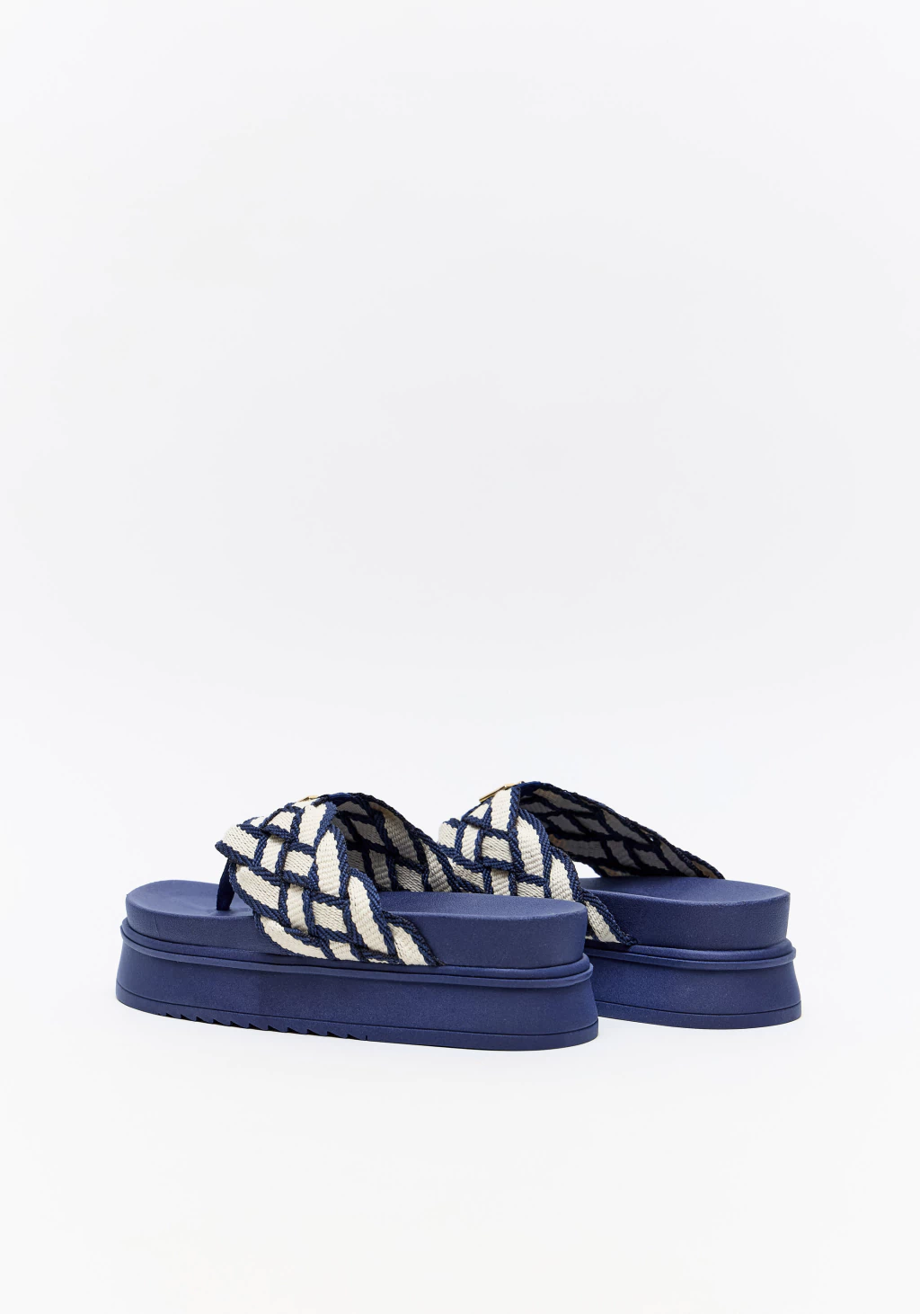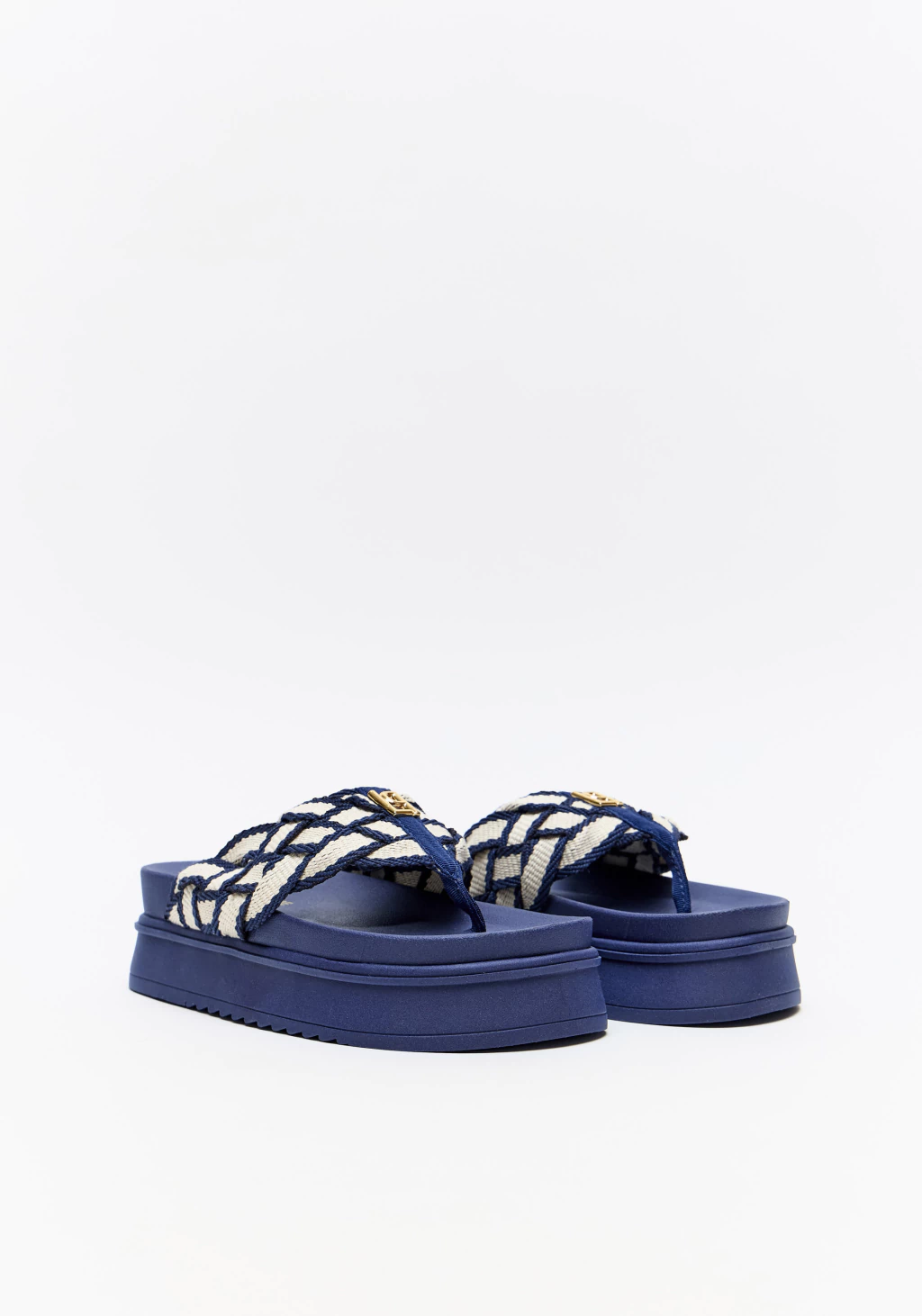 O tamanco plataforma Lança Perfume aposta em um visual náutico e moderno, ideal para produções de verão com estilo e conforto. Confeccionado com cabedal em tecido tramado bicolor azul e cru, o modelo apresenta textura sofisticada e toque artesanal.