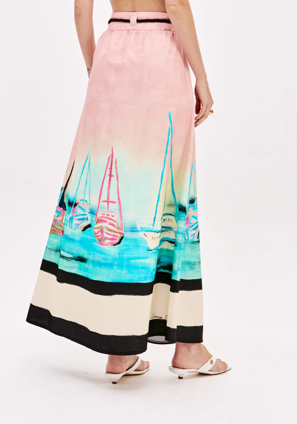 Migas a saia super midi estampada, confeccionada em tecido plano e leve, traz modelagem evasê que se abre delicadamente a partir da cintura, garantindo movimento e feminilidade ao look. Com cintura alta, bolsos laterais funcionais e fechamento lateral em zíper, a peça alia praticidade e estilo. O cinto em cordão arremata a proposta com charme artesanal, tornando-a um item versátil para produções sofisticadas e descontraídas.