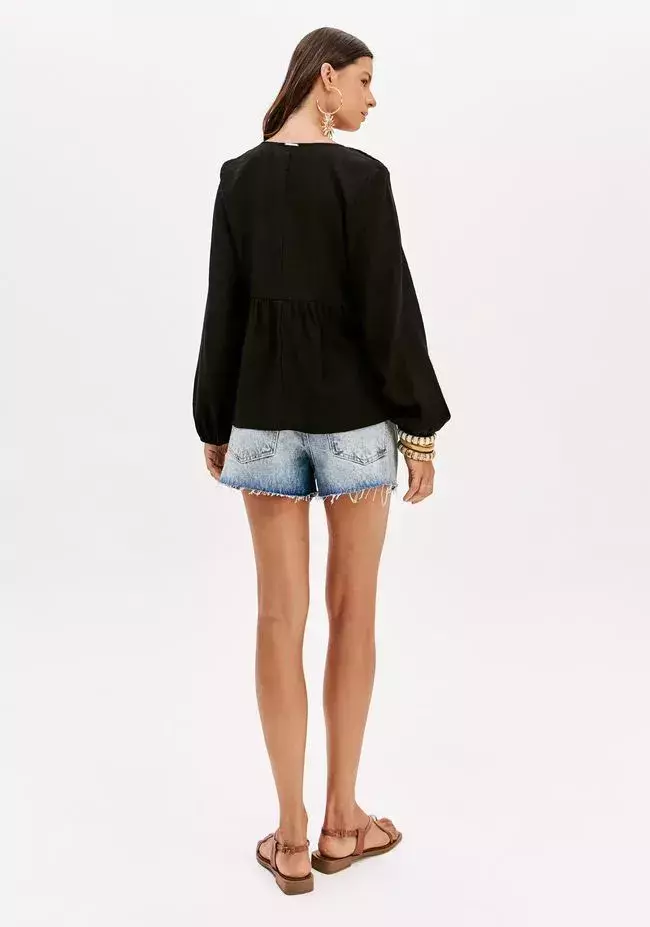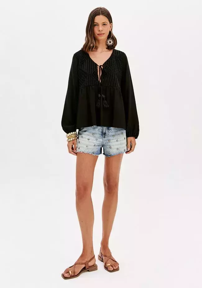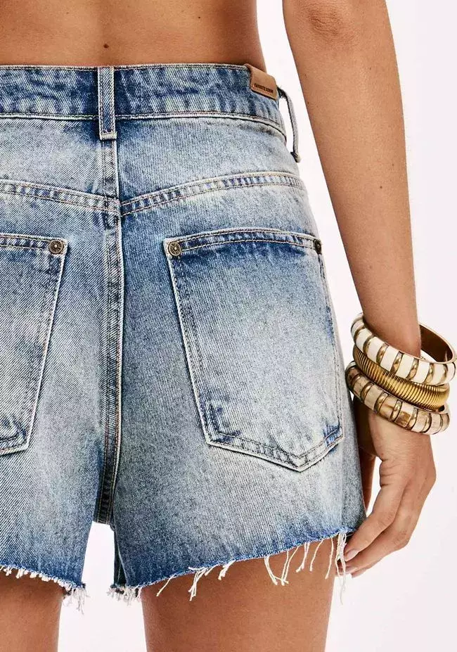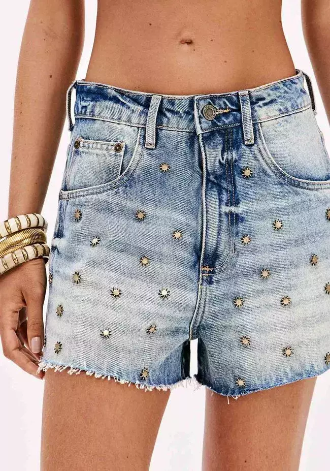 Migas o short jeans relaxed é o match perfeito entre conforto e estilo. Com cintura alta, a peça se destaca pelas aplicações metálicas que adicionam brilho e personalidade ao visual. Conta ainda com bolsos funcionais, cós com passantes e barra desfiada, traduzindo modernidade e praticidade em uma única proposta.