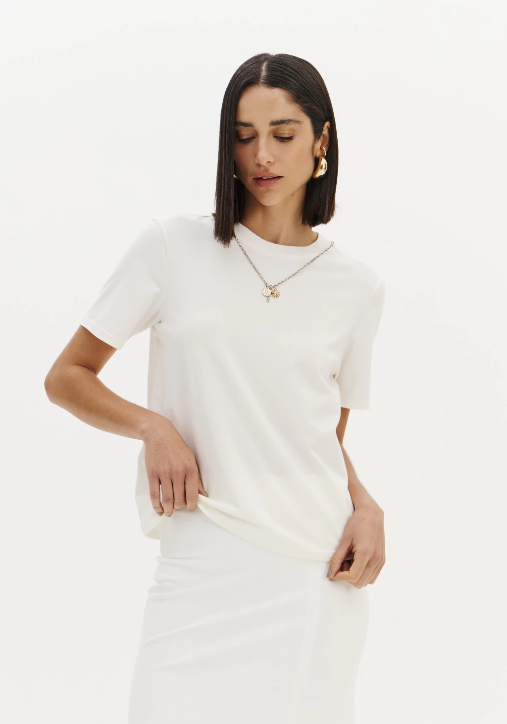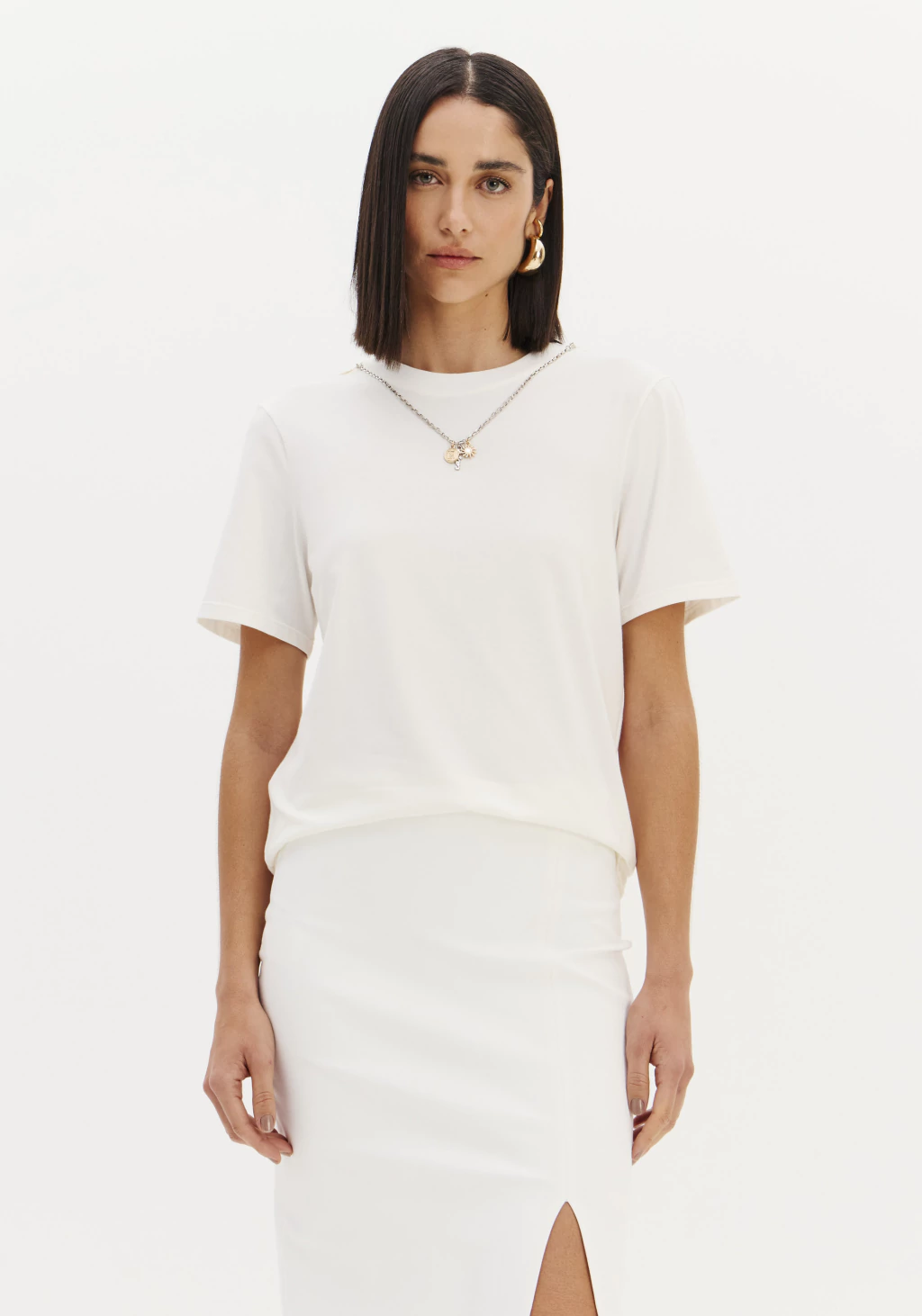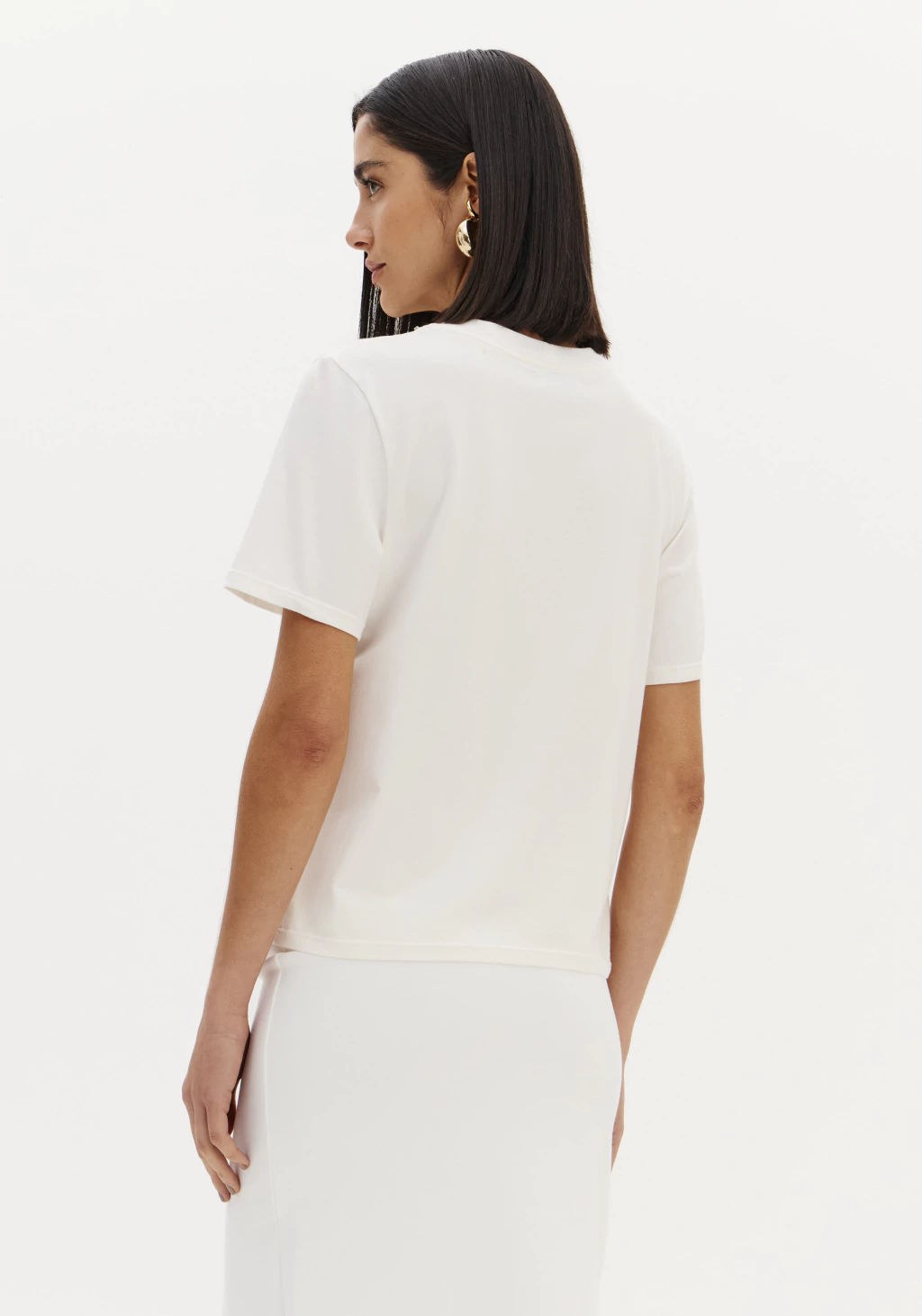 A t-shirt em malha leve e macia proporciona conforto e um toque agradável à pele. Com modelagem regular, possui mangas curtas, gola redonda e caimento solto, oferecendo praticidade e estilo para o dia a dia.