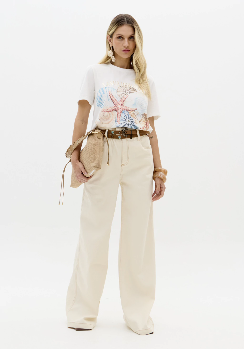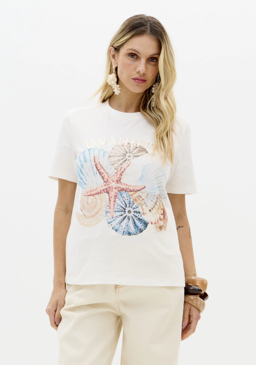 O destaque fica por conta da estampa frontal de conchas e estrelas do mar em tons suaves, com aplicação de brilho sutil e o logo Lança Perfume metalizado, que reforça o ar praiano e elegante da coleção.