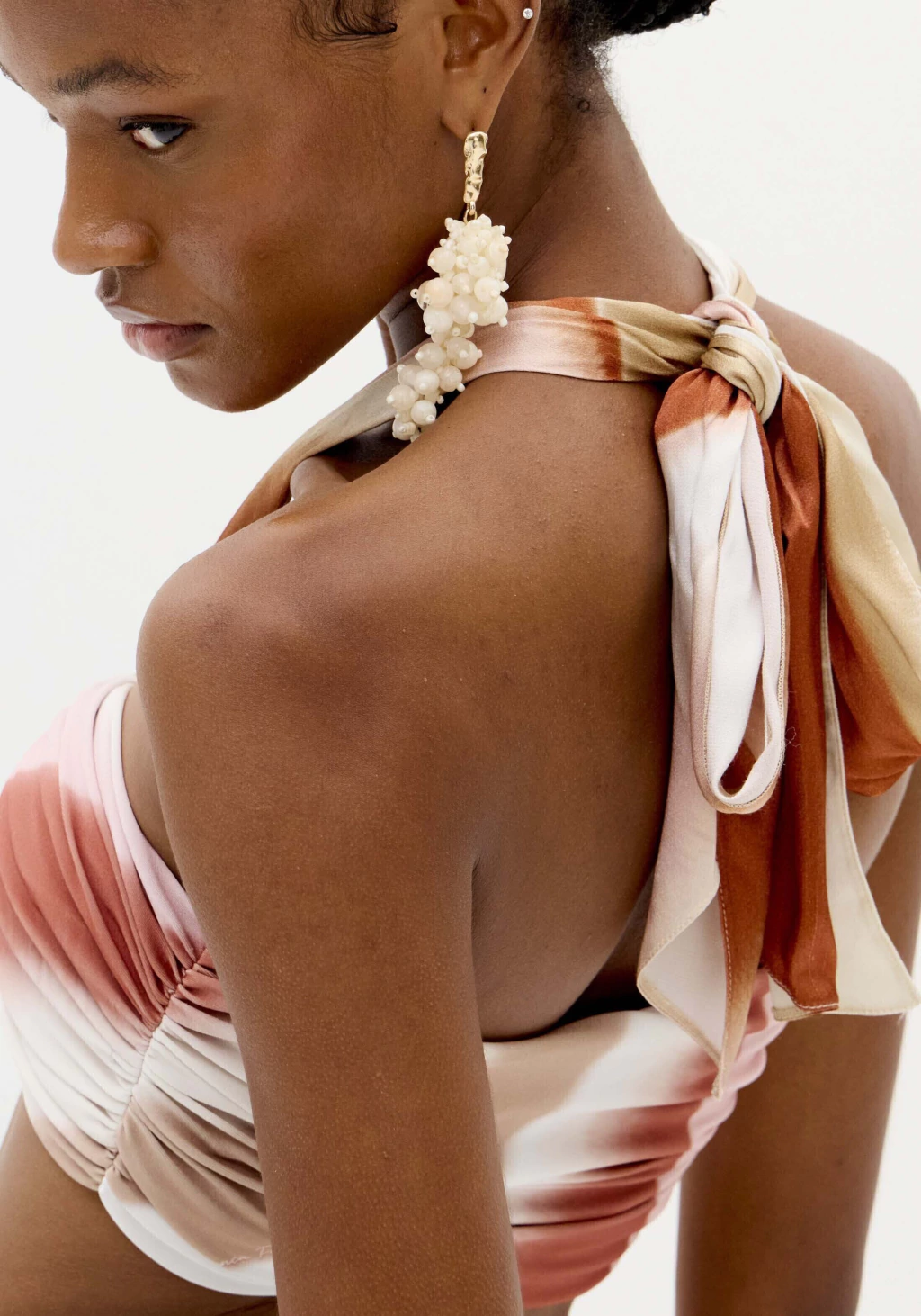 O top frente única é confeccionado em malha pesada e encorpada, garantindo caimento ajustado e estruturado ao corpo. Possui drapeados laterais que valorizam a modelagem, além de passante central no decote e faixa para amarração posterior, trazendo um toque moderno e cheio de estilo para produções marcantes.