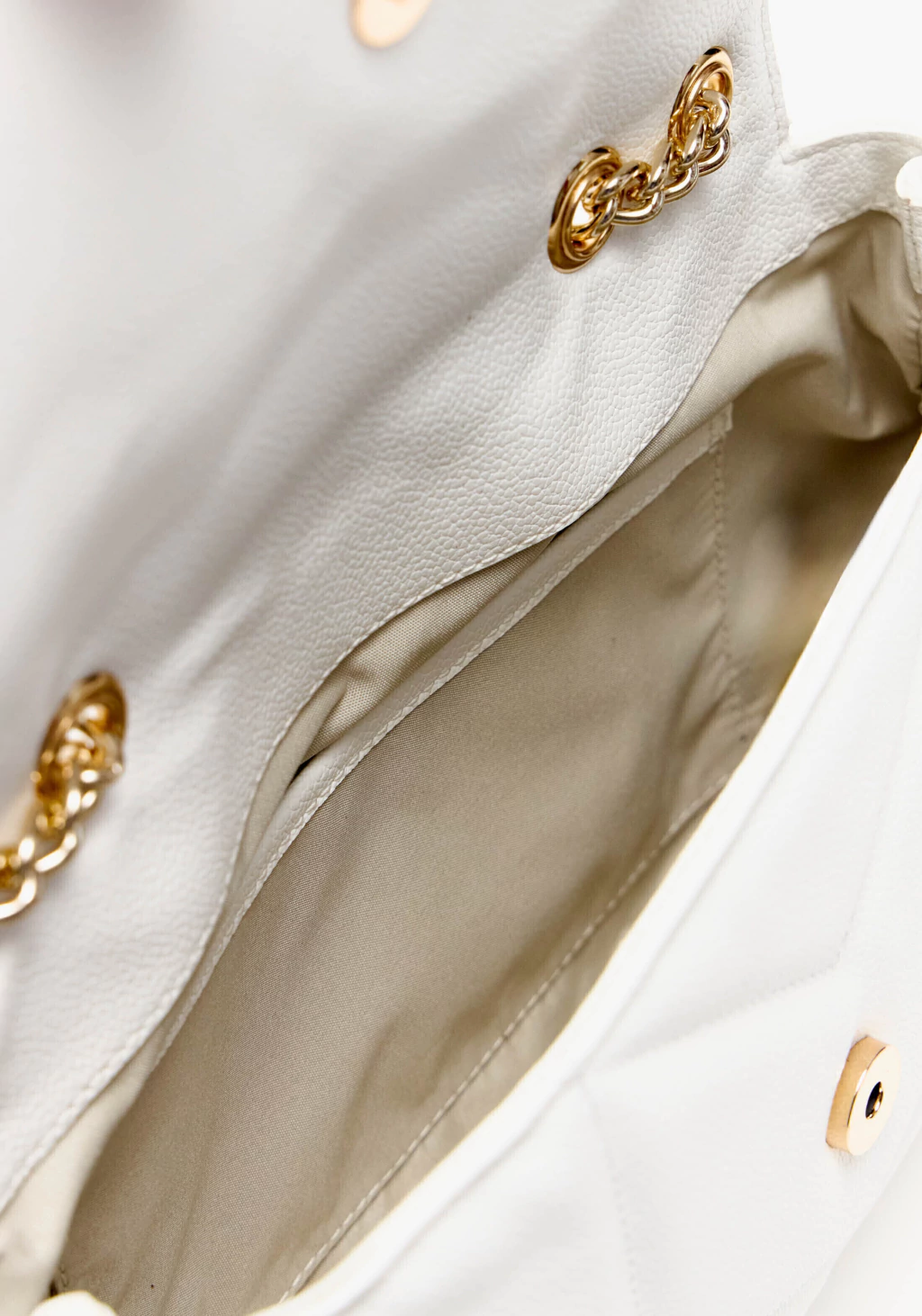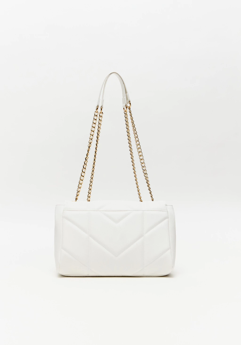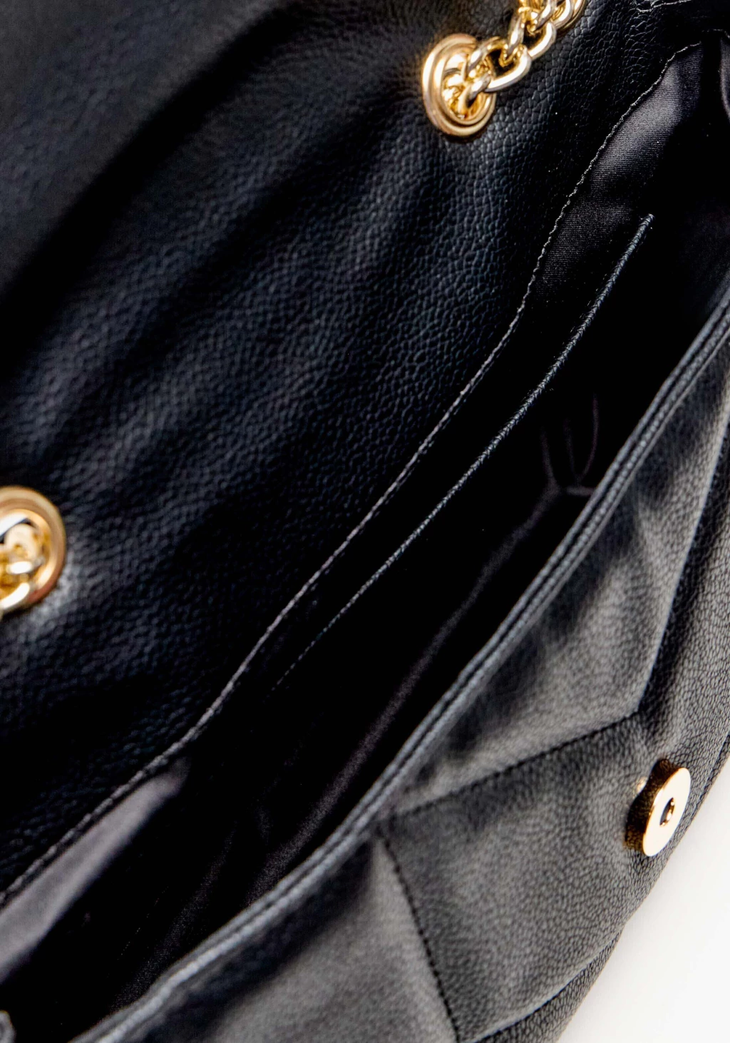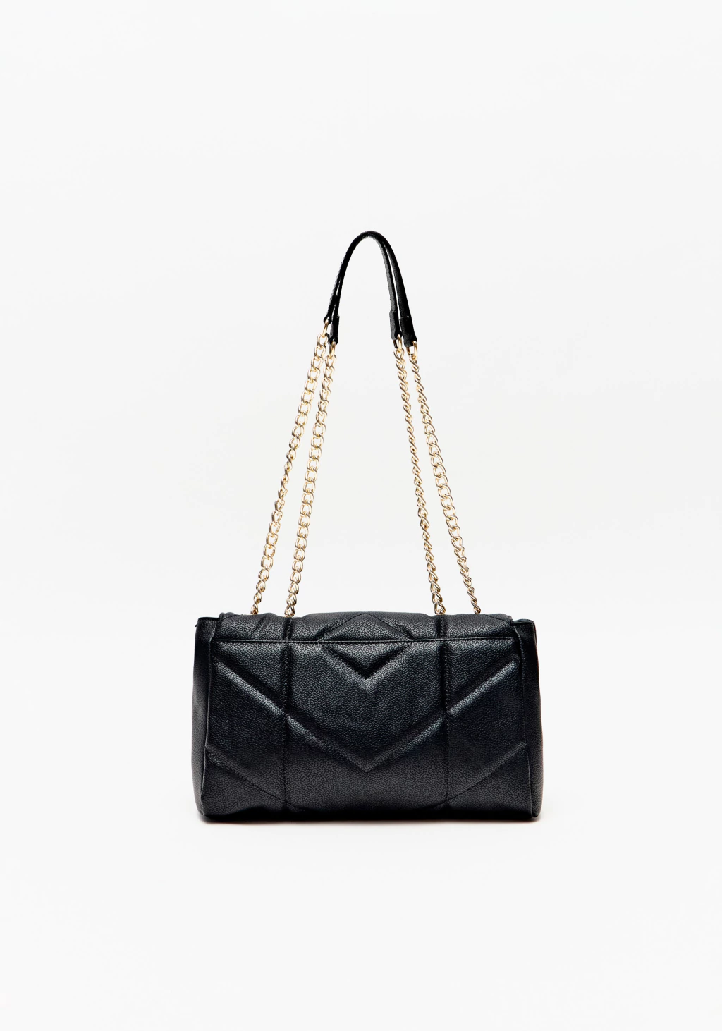 O modelo conta com alça ajustável e corrente decorativa, além de alça de mão estruturada, permitindo diferentes formas de uso — tiracolo ou handbag. O interior é forrado e espaçoso, ideal para acomodar os itens essenciais do dia a dia com organização.