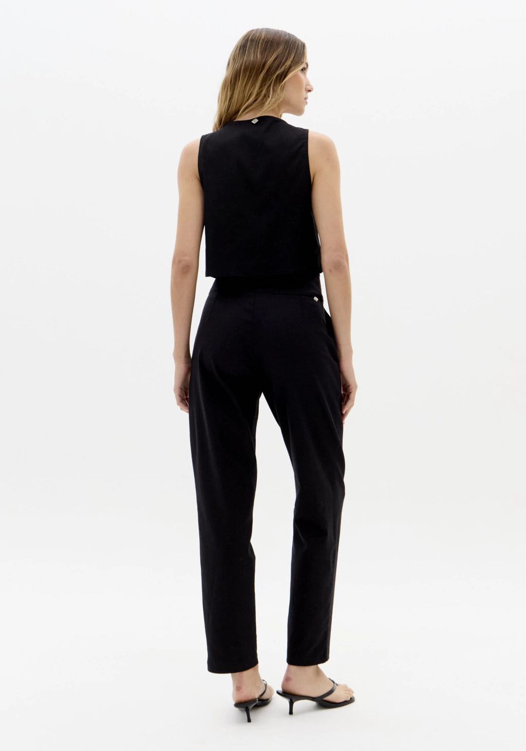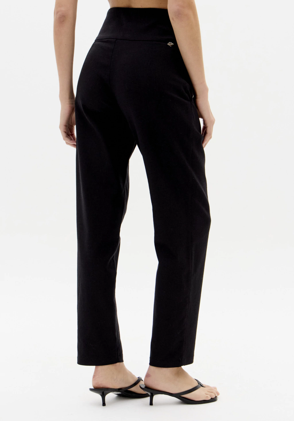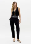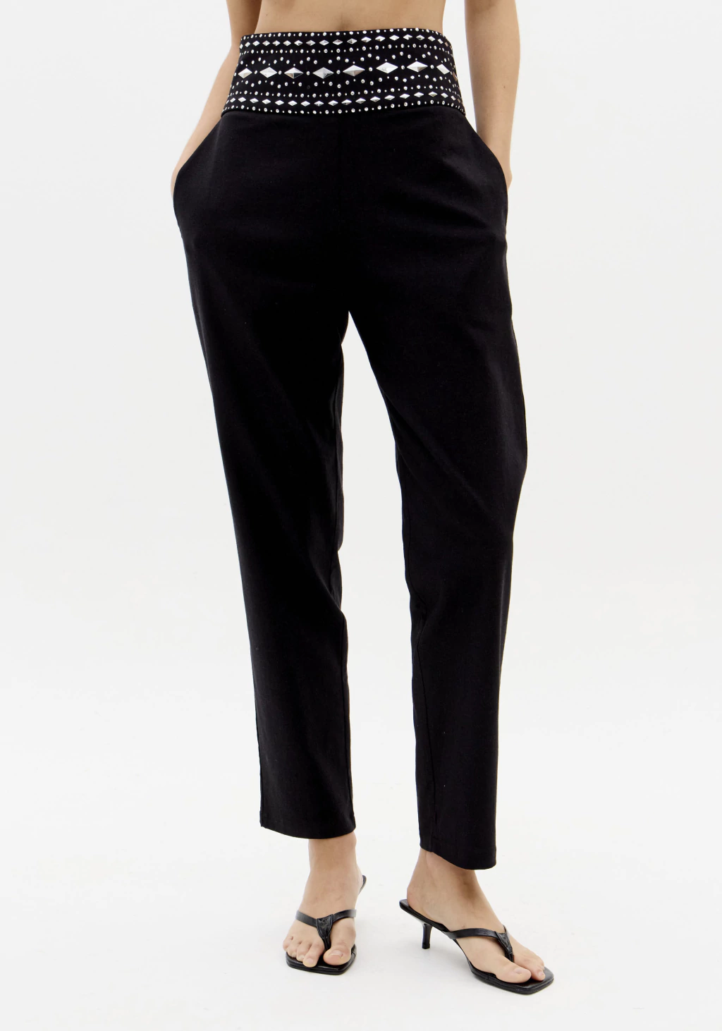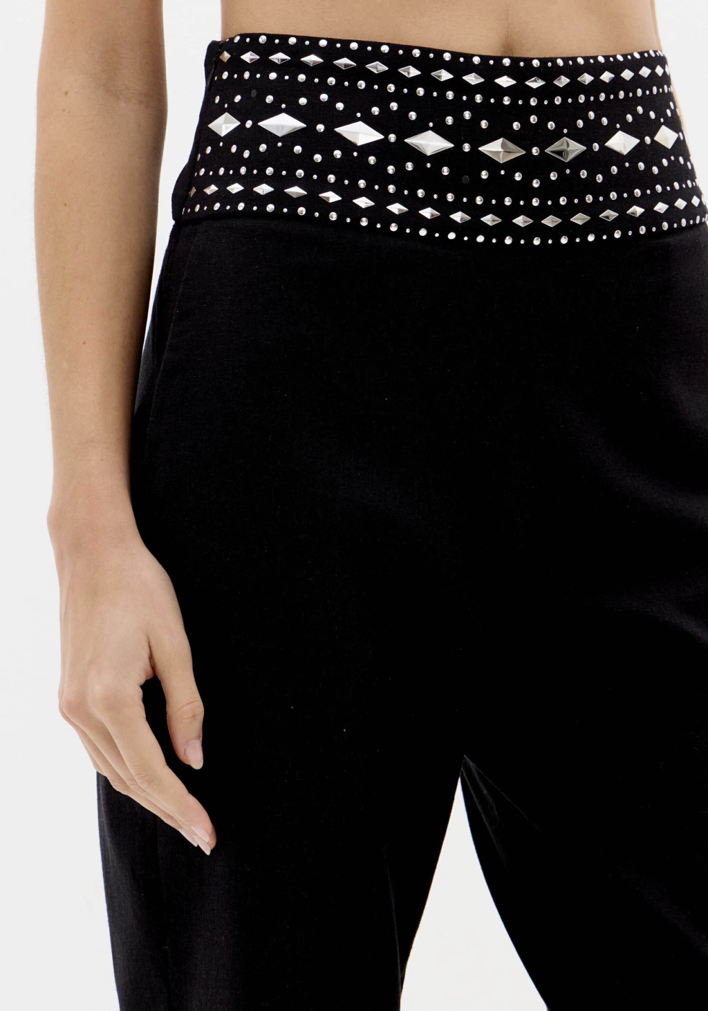 A calça confeccionada em linho une conforto e sofisticação em uma modelagem reta e elegante. Possui cintura alta com cós largo ricamente adornado por aplicações de tachas e espelhos geométricos que agregam brilho e personalidade à peça. O tecido em linho garante leveza e toque natural, enquanto o caimento solto proporciona movimento e elegância. Ideal para composições modernas e refinadas, que transitam do dia à noite com estilo.