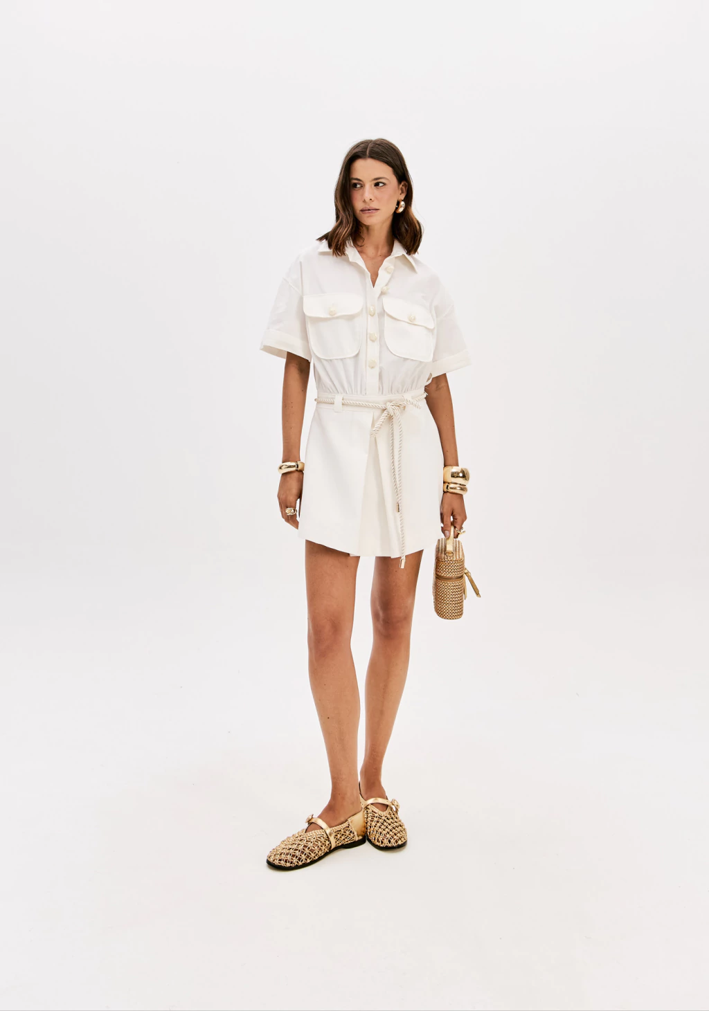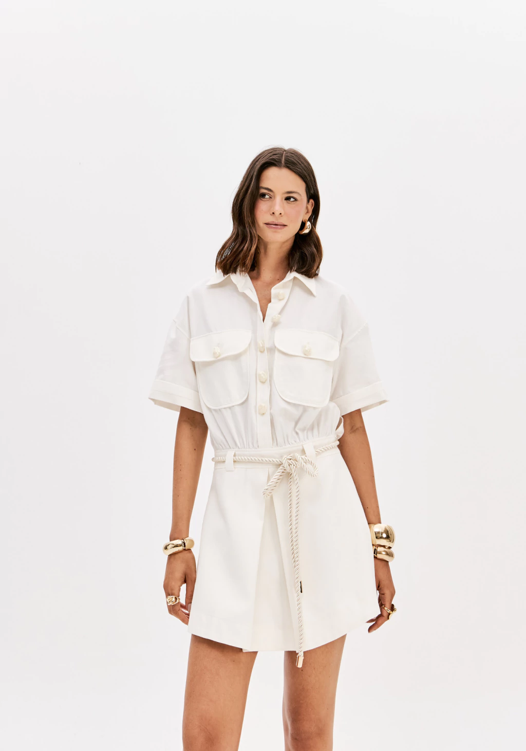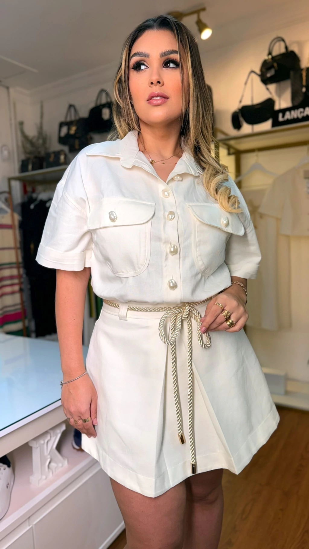 Com design moderno e funcional, o macacão curto é confeccionado em tecido encorpado, oferecendo caimento impecável e conforto. A peça conta com mangas médias, bolsos com lapela e fechamento por zíper e botões, além de modelagem short saia que garante praticidade no dia a dia.